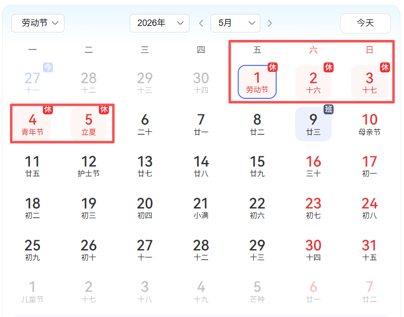 依据国务院办公厅《关于2026年部分节假日安排的通知》:劳动节,5月1日(周五)至5日(周二)放假调休,共5天,5月9日(周六)上班。